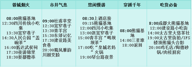 5.如您的時間充裕,可在自由活動時間前往游覽成都文化地標(武侯祠、錦里、杜甫草堂、寬窄巷子、春熙路、太古里等)、品嘗成都特色小吃(擔擔面、夫妻肺片、龍抄手、韓包子、鐘水餃、三大炮、賴湯圓、九尺板鴨等)。