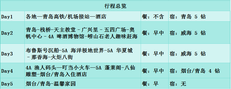 餐飲:行程所列 4 早 3 正,正餐餐標 40/人起,十人一桌,人數不夠十人相應減少菜品,升級青島本幫菜、威海魯味宴、蓬萊海鮮自助/大鍋。