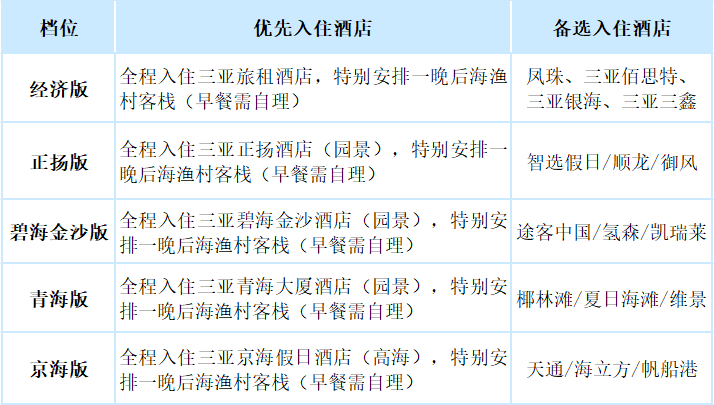 備注:海南酒店多為旅游度假酒店,標準較內地偏低,遇旺季等特殊情況,如因房源緊張,將安排不低于以上酒店檔次的酒店
