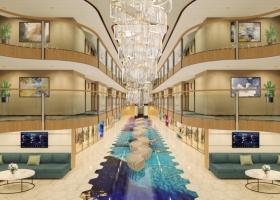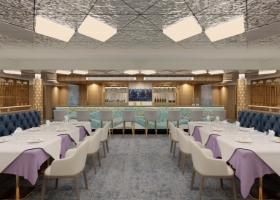 郵輪共有4個(gè)餐廳、2個(gè)包房。主餐廳分上下兩層,采用大小搭配的方式,下層餐廳面積達(dá)875m2,餐位數(shù)超過300人,二層餐廳505m2,餐位數(shù)160人,單獨(dú)設(shè)有兩個(gè)包房,兩層餐廳的連通樓梯設(shè)于尾部,創(chuàng)新的采用全玻璃觀景結(jié)構(gòu)設(shè)計(jì)和尾部的挖空設(shè)計(jì),提升了空間的舒適感和開闊感。內(nèi)裝設(shè)計(jì)上,依然采用現(xiàn)代簡(jiǎn)約與中式文化的結(jié)合,使整個(gè)空間簡(jiǎn)約而有內(nèi)涵,并采用在上下兩層有差別的設(shè)計(jì),豐富視覺感受,滿足不同的使用需求。