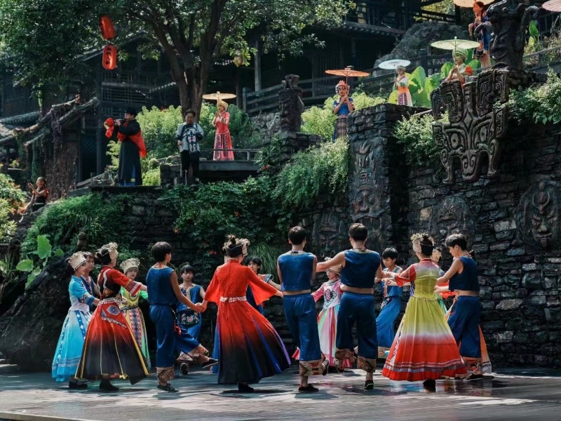 10:10- 14:30:下船游覽山上人家(石令牌、 巴王宮、茶鹽古道非遺傳承一條 街、巴王寨 , 三棵樹廣場觀看演出)。自理中餐后游覽龍津溪(龍溪橋、鵲橋、婚嫁樓表演、峽江號子、 迎賓表演)。