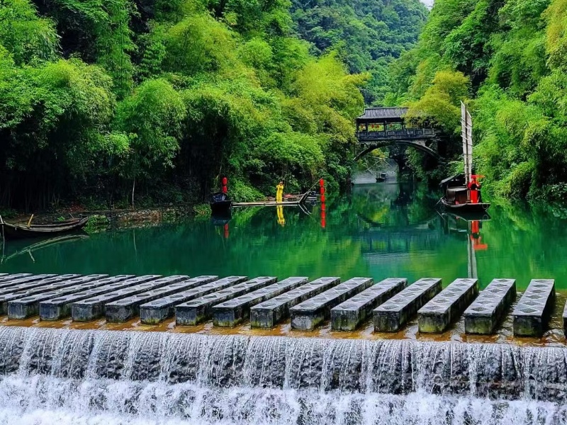 12:00換乘中轉(zhuǎn)車(chē)前往胡金灘碼頭,渡船過(guò)江后游覽山上人家(石令牌、 巴王宮、茶鹽古道非遺傳承一條街、巴王寨,三棵樹(shù)廣場(chǎng)觀看演出),之后前往游覽龍津溪(龍溪橋、鵲橋、婚嫁樓表演、峽江號(hào)子、 迎賓表演)。