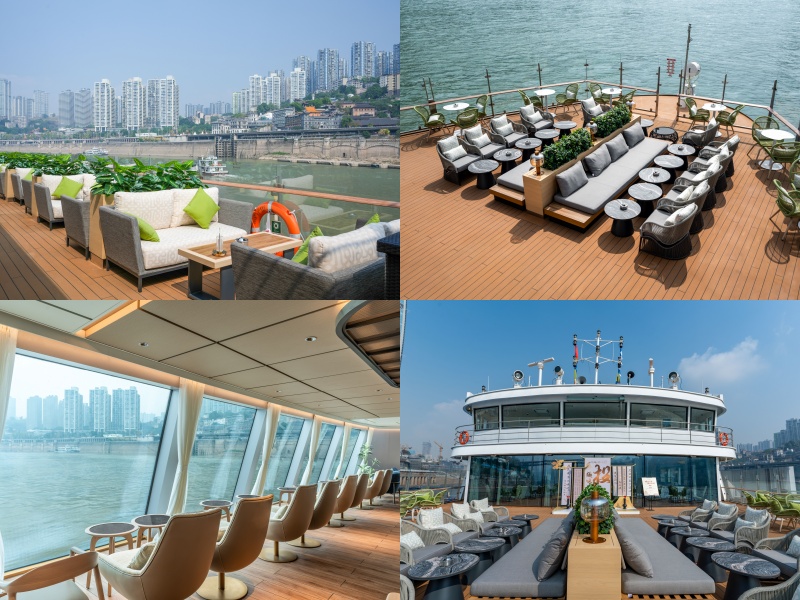 (第四層):有觀山水露天觀景區,為游客提供開闊的露天觀景場所,可全方位欣賞三峽風光。也有覽江閣(貴賓區)會有咖啡、飲料,小吃等提供還有兒童樂園,為兒童游客提供專屬的游樂空間,讓孩子們在游輪上也能盡情玩耍。此外,設有攝影工作室,可為游客提供攝影服務,幫助游客記錄下在游輪上的美好瞬間,以及駕駛室,是游輪的指揮中心,負責游輪的航行操作。