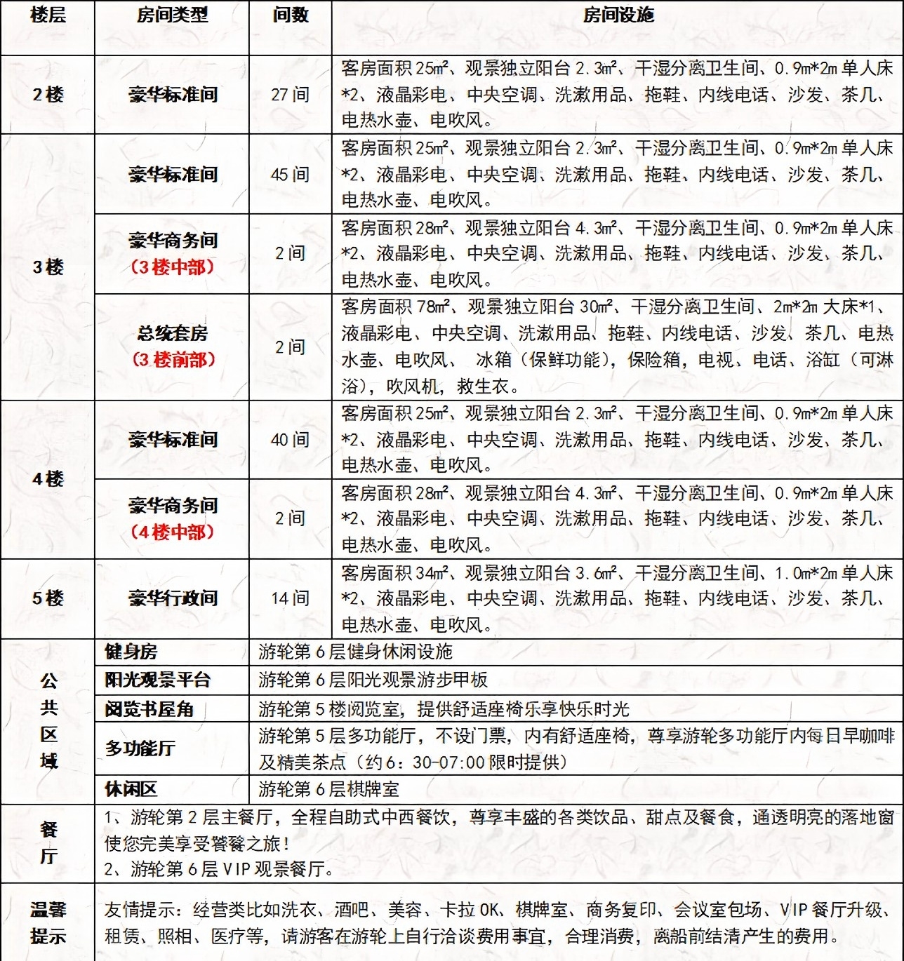 1、樓層安排及升級樓層:游客入住樓層為船方隨機安排(基礎樓層為2層),內賓升級樓層為150元/人/層(請自行前往游船前臺申請或提前繳費預訂辦理),外賓價格現詢;要求左旋或者右旋的房間+200元/間