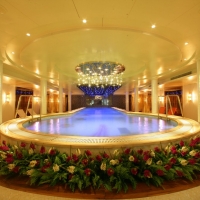 設有室內恒溫泳池、健身房、電影院、SPA按摩房、酒吧、棋牌室、KTV、兒童樂園等,頂層還有陽光甲板供游客欣賞風景。